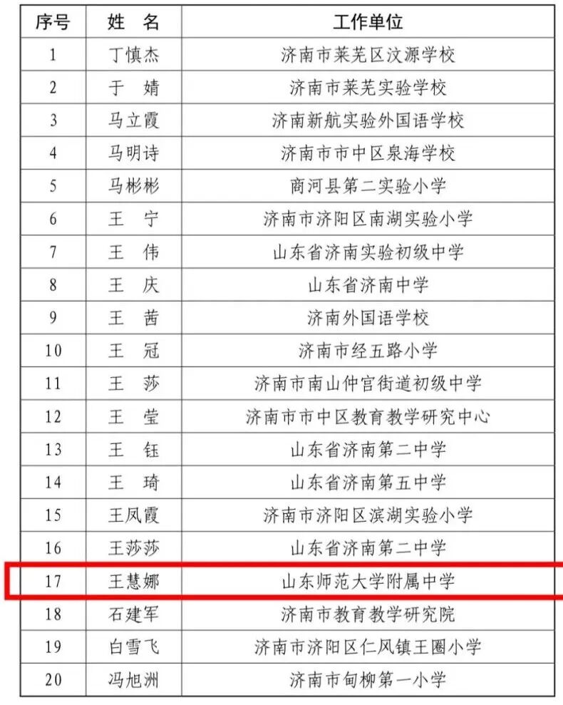 近日,济南市教育局正式发布《关于公布第四期济南名师和第三期济南优秀教育管理者人员名单的通知》(济教办〔2025〕18号),山东师范大学附属中学喜获双项荣誉,王慧娜被认定为“第四期济南名师”,李贵玲被认定为“第三期济南优秀教育管理者”。