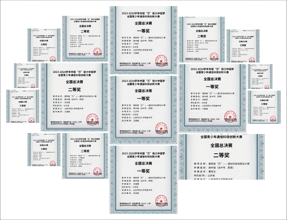近期,由中国通信工业协会主办的2023-2024学年中国“芯”助力中国梦——全国青少年通信科技创新大赛全国总决赛顺利落下帷幕。在这场科技创新盛宴中,山东师大附中学子斩获佳绩,国赛省赛双丰收。张春絮、卢柯宇、王识为、肖佳耕获得全国一等奖,陈慷宇等6位同学获得全国二等奖,吕泓锐等10名同学获得全国三等奖!山东师大附中被评为全国优秀组织单位。科创教练王佩佩、张清睿、傅冬被评为全国优秀指导教师。