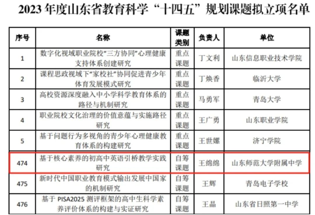 日前,经山东省教育科学规划领导小组办公室审批、公示,山东师大附中英语组王绵绵老师申报的课题“基于核心素养的初高中英语引桥教学实践研究”被拟立项为山东省教育科学“十四五”规划 2023年度课题。
