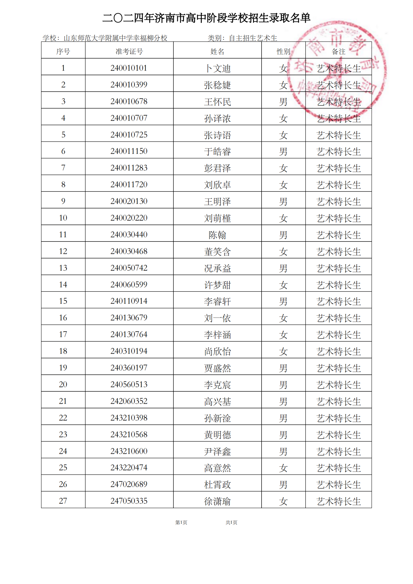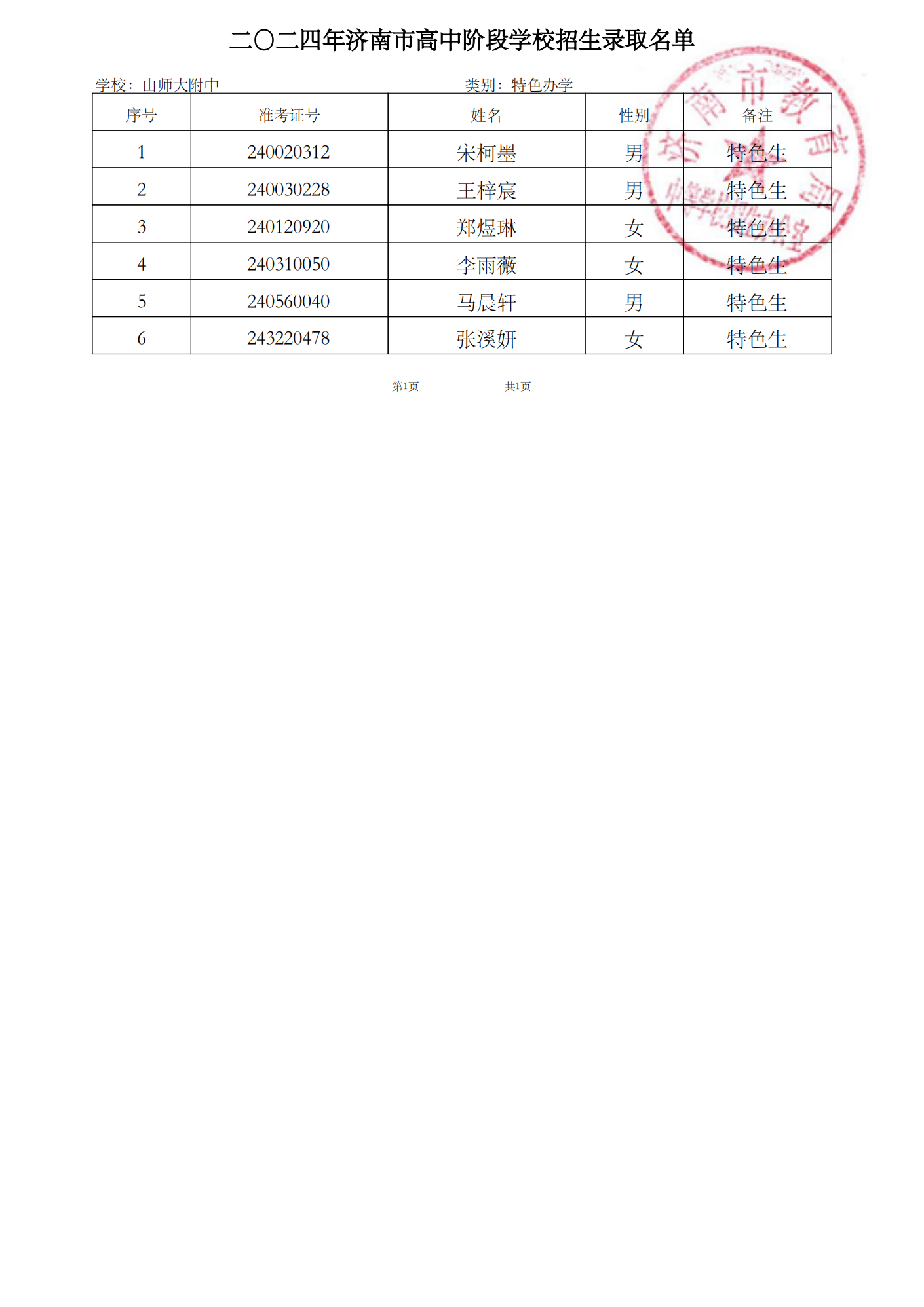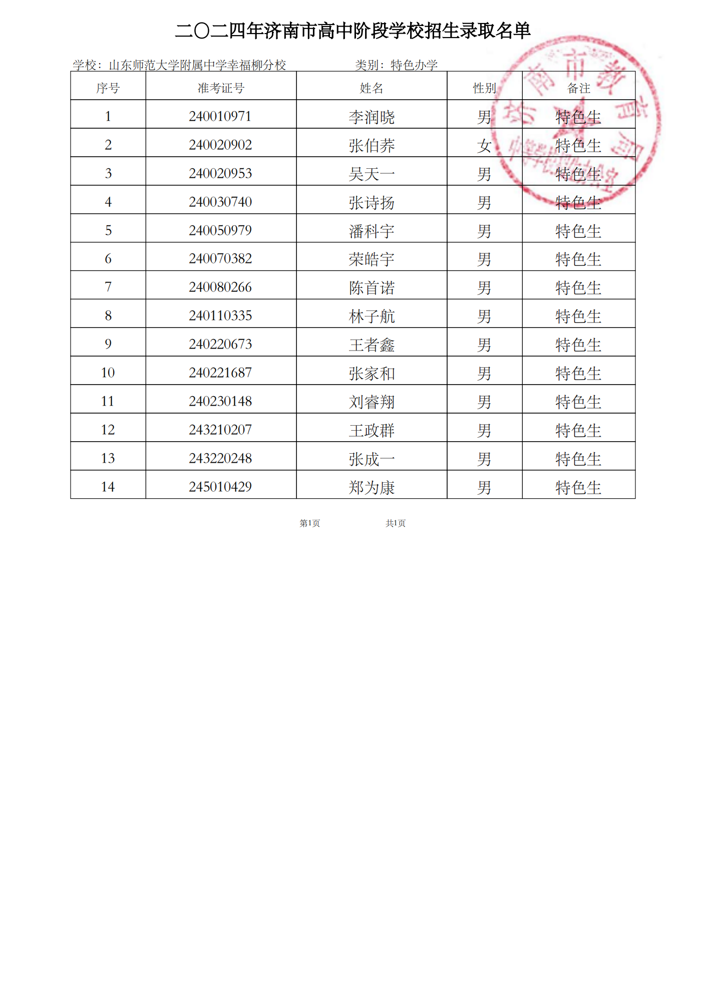 山东师范大学附属中学校本部统招生录取158人,山东师范大学附属中学幸福柳分校录取584人。经审核,2024年我校招生计划全部完成。现将我校第二批录取的山师附中计划和幸福柳分校计划学生名单公布(以准考证号为序)。特此公告。