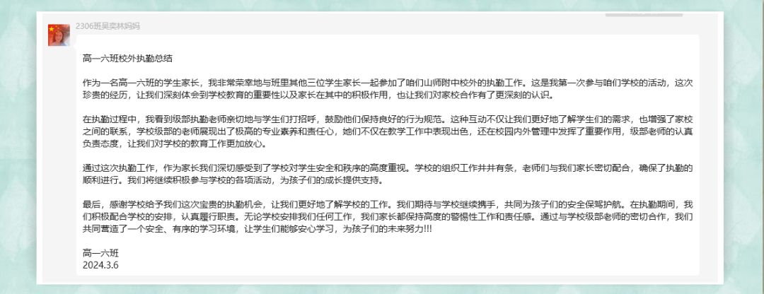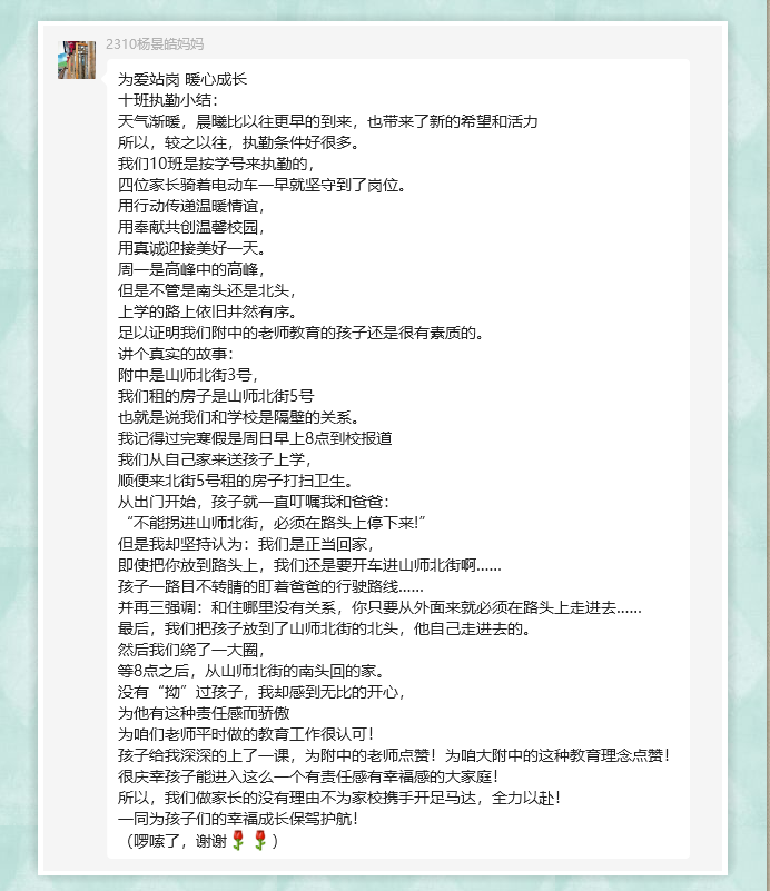 早晨的执勤经历更使我深刻体会到了家校共育的重要性,以及每一个为了孩子的明天而在背后默默付出的人的伟大。真的共同携手,为孩子们的成长护航,让他们在安全有序的环境中快乐学习,健康生活,向未来展翅翱翔。