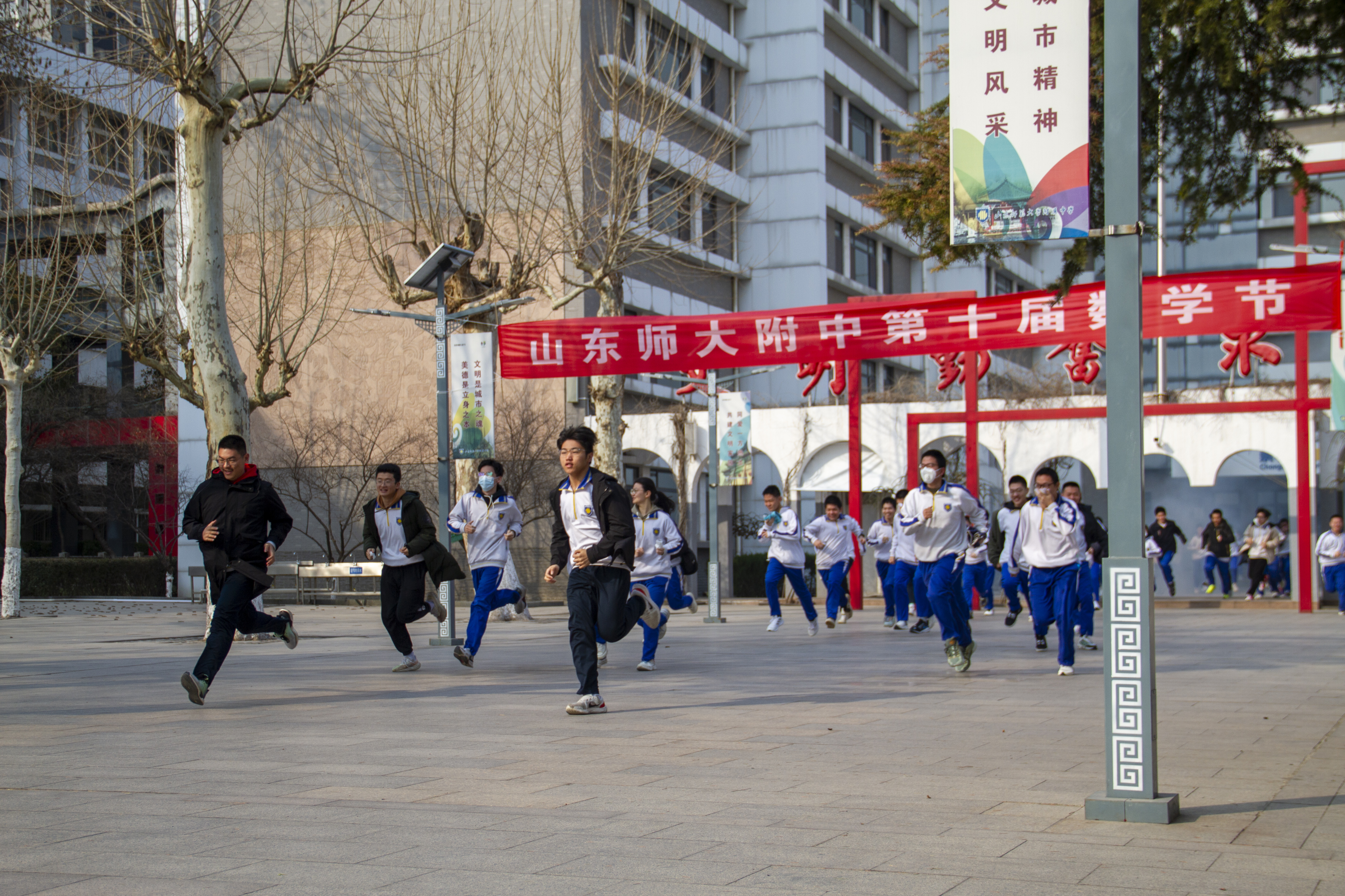 学校紧急撤离的哨声响起,各楼层、各疏散通道负责老师迅速到位,按照《山东师大附中2024年3月消防应急疏散演练方案》要求组织师生按规定路线跑步疏散到运动场指定位置。