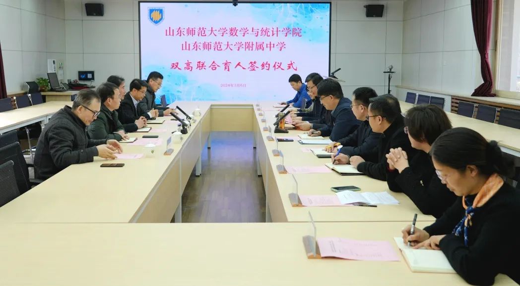 3月6日下午,山东师范大学数学与统计学院与山东师大附中举行高中、高校(简称“双高”)联合育人签约仪式。山东师范大学数学与统计学院党委书记战秉聚,党委副书记、执行院长赵强,党委副书记、纪委书记葛海滨,副院长周兆杰,数学教师教学发展中心主任杨泽忠,山东师大附中校长苗禾鸣,党委书记杨仁勇,副校长李成金,教务处、教科处、项目部、数学教研组等部门负责人参加活动。