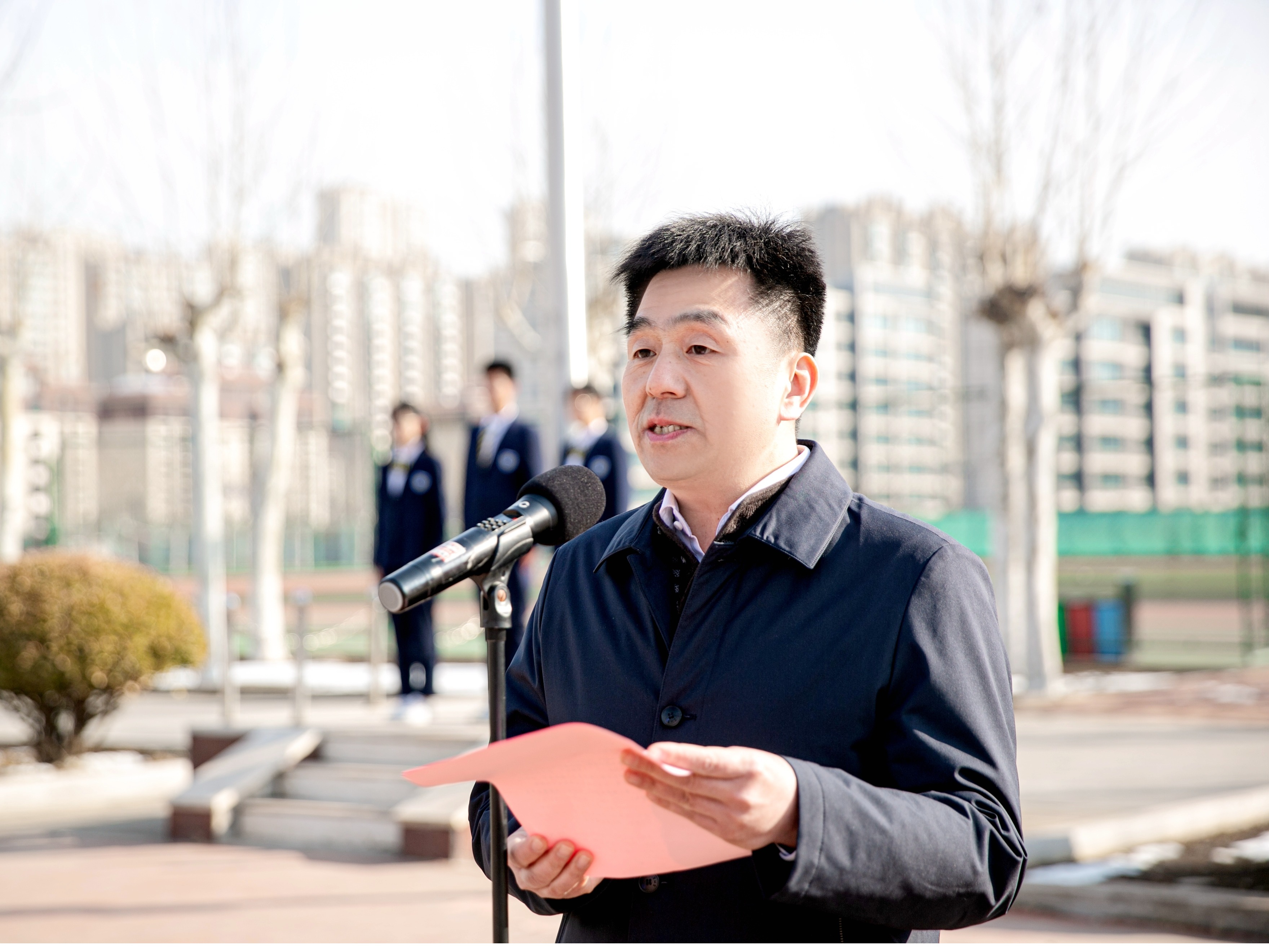 山东师大附中副校长、幸福柳分校执行校长王彬,副校长、校本部执行校长杨平分别在两校区作国旗下讲话。