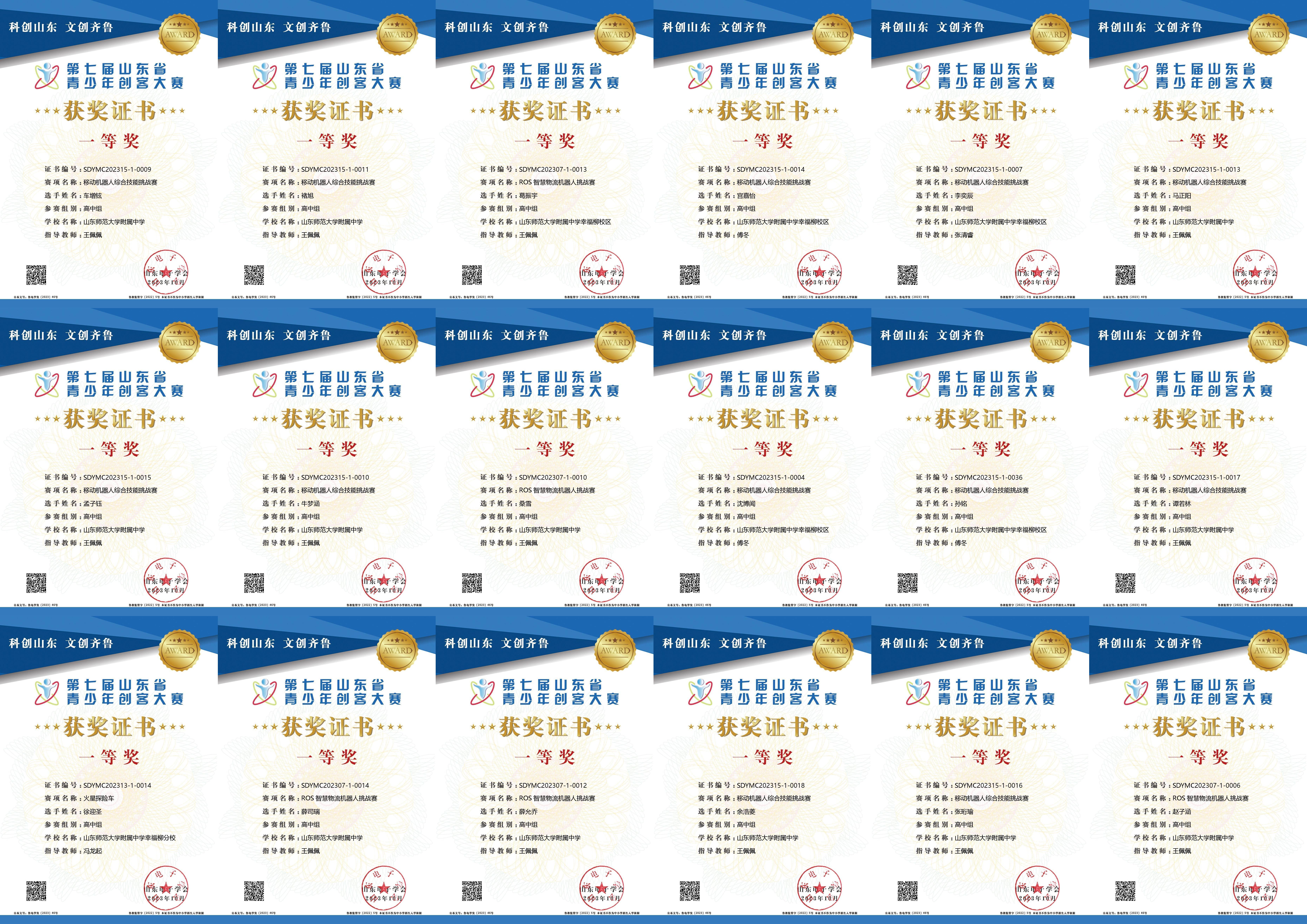山东师大附中学子喜获佳绩,其中在“ROS智慧物流机器人挑战赛”赛项中10人获得一等奖,9人获得二等奖,3人获得三等奖。在“移动机器人综合技能挑战赛”赛项中14人获得一等奖,17人获得二等奖,21人获三等奖,在本次比赛中附中学子共计74人获得奖项。山东师大附中科创团队王佩佩、傅冬、张清睿获得优秀指导教师。
