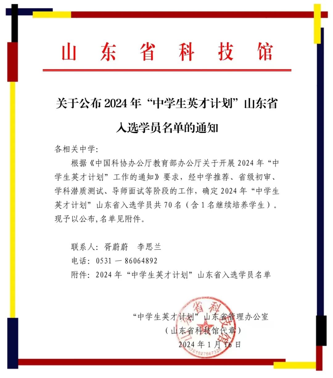 1月16日,山东省科技馆公布2024年“中学生英才计划”山东省入选学员名单,山东师大附中入选15人。继2023年入选13人,今年入选人数再次蝉联省内第一