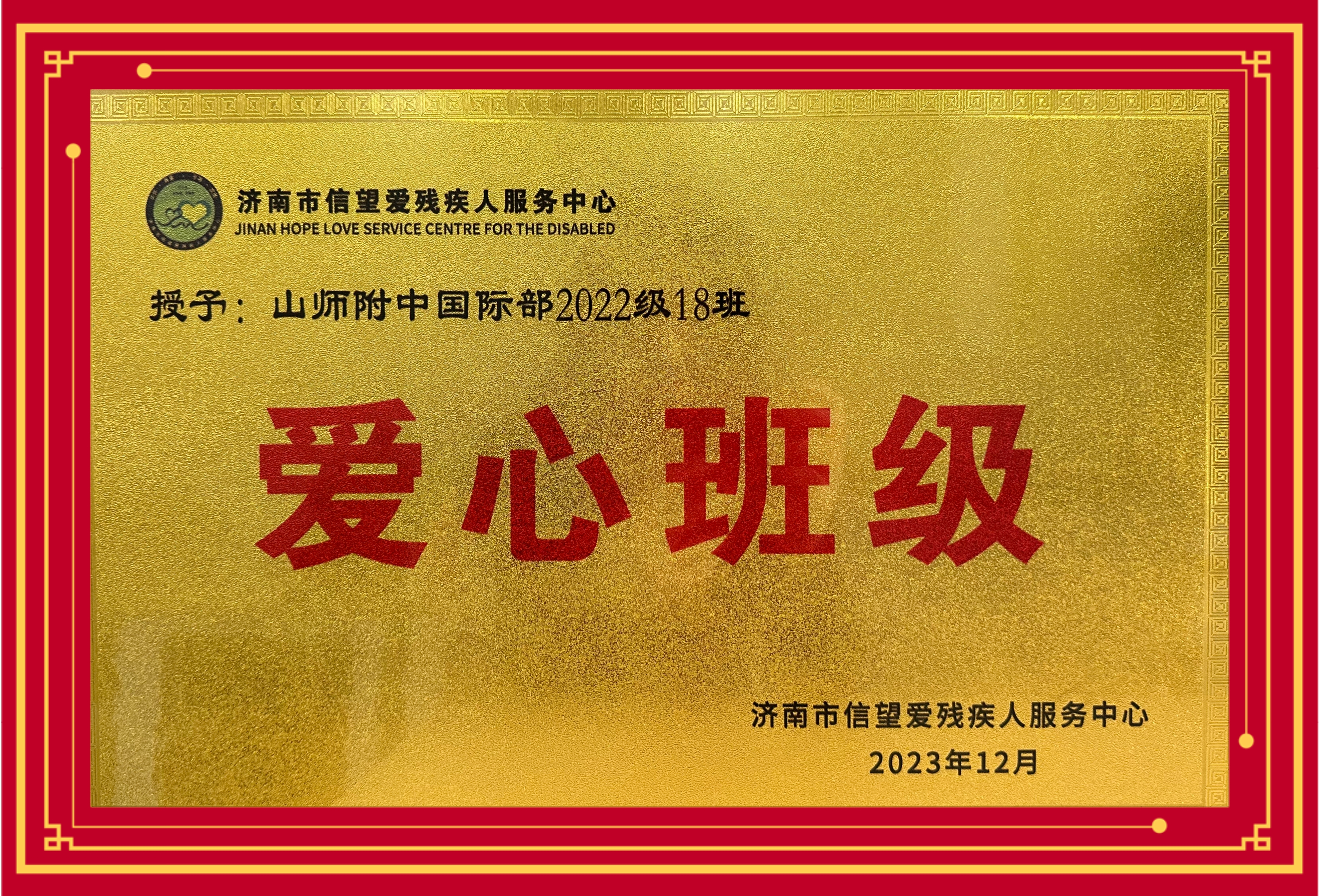 济南市信望爱残疾人服务中心为表彰同学们的公益精神,向2022级18班和2022级19级颁发“爱心班级”奖牌。这是一份荣誉,更是爱心的汇聚。