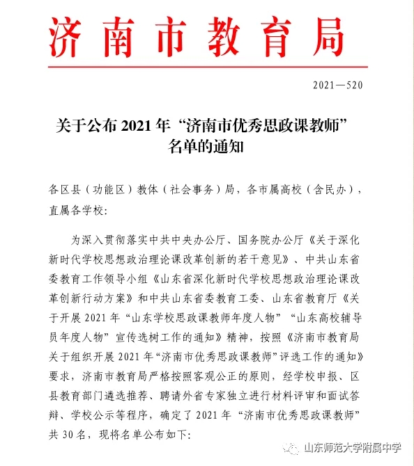 2021年11月18日,济南市教育局发布了《关于公布2021年“济南市优秀思政课教师”名单的通知》。山东师范大学附属中学付海建老师喜获“济南市优秀思政课教师”荣誉称号。