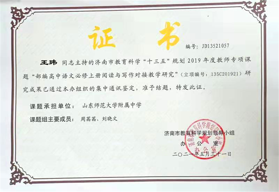 “部编高中语文必修上册阅读与写作对接教学研究”是由语文组王玮、周茜茜、刘晓文三位教师协力攻坚的济南市“十三五”规划教师专项课题。课题选题缘起于2019年秋季学期高中语文学科全国统编教材启用之时,研究历时一年半,旨在为新教材的使用寻求理论支撑以及与其对应的实践对策。课题组依托认知心理学的学习迁移理论制定了针对新教材的读写对接教学策略和相关读写对接教学方案,力求课题研究理论支撑的科学性和有效性;在突出新教材“单元学习任务”“单元人文主题”“群文阅读教学”等新落点的同时,课题组着重开发了新教材指定阅读书目——《乡土中国》整本书阅读与写作的对接点,力求从阅读致用性和写作学理性上突显读写对接研究的必要性和重要性。伴随着2020年初《中国高考评价体系》的颁布,课题组将语文教学传统议题置于新课程、新教材、新高考三个新维度之下,以新带旧,推陈出新,力求课题研究的延续性和实效性。作为教师专项课题,课题研究注重接轨新教材创新之处,强化核心素养的养成,对提升阅读教学与写作教学的教学品质有重要意义,课题组发表的多篇论文也有较强的学术价值,得到了结题鉴定专家的充分肯定和一致好评。