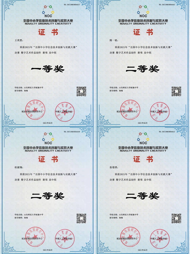 8月26日,NOC官网公布了2021年第十九届全国中小学信息技术创新与实践大赛(简称NOC大赛)的国赛获奖成绩,山东师大附中“数字作品梦之队”的4名参赛选手全部获奖,其中王奕然荣获全国一等奖,隋一铭、桂健翔、张璟琪荣获全国二等奖,杨梅老师荣获全国优秀指导教师称号。