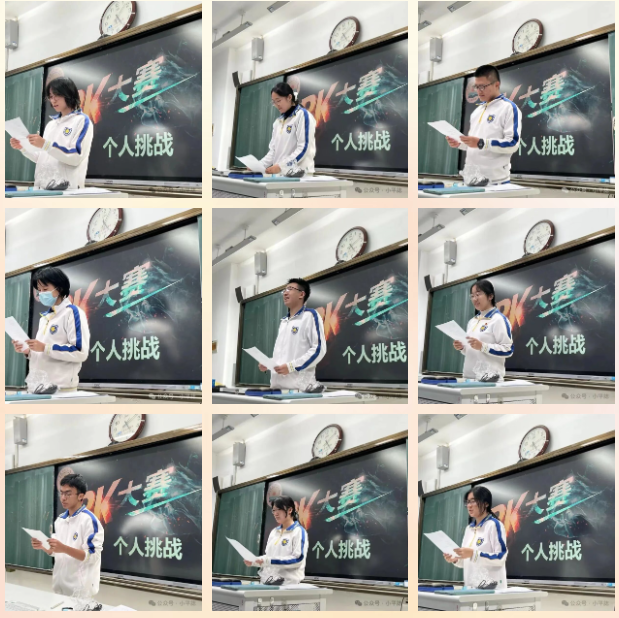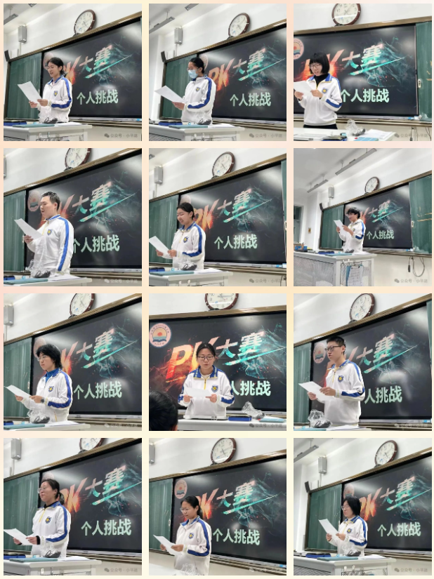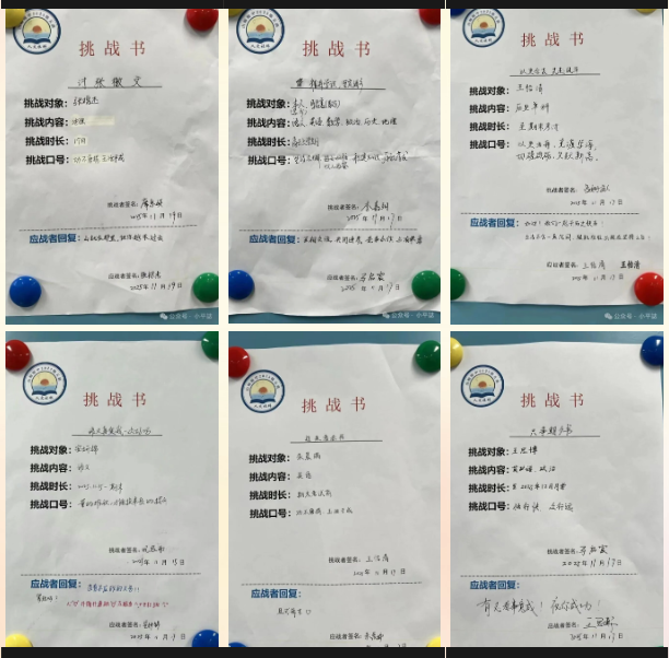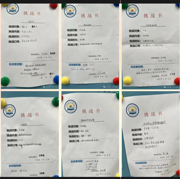 在“个人挑战”环节,全班同学依次上台宣读自己的“挑战书”,报出挑战书的名称,说出挑战对象、内容、时长,喊出口号,最后双手把挑战书交到被挑战者的手上。被挑战者要做出“应战回复”,个人挑战赛正式开始!