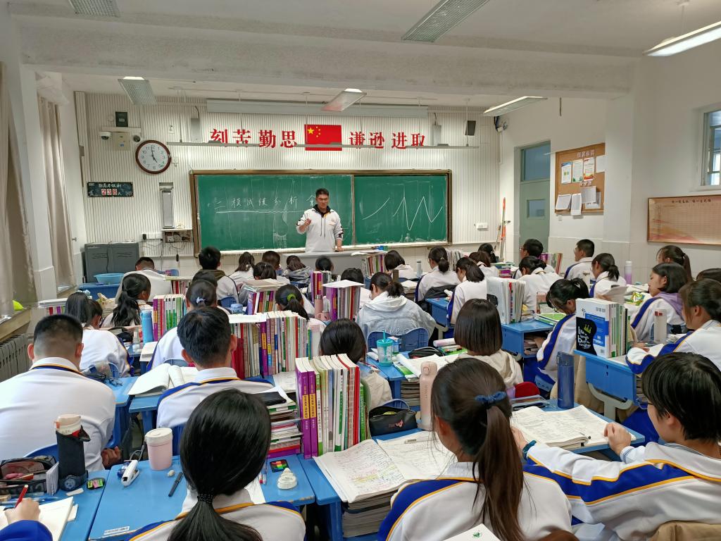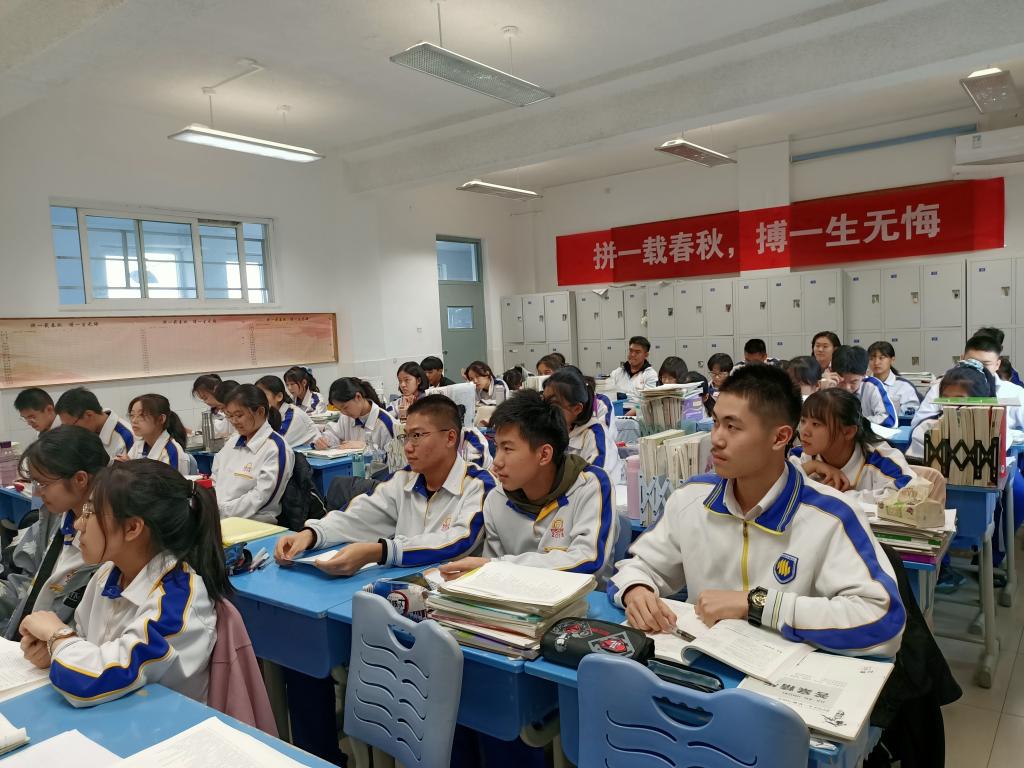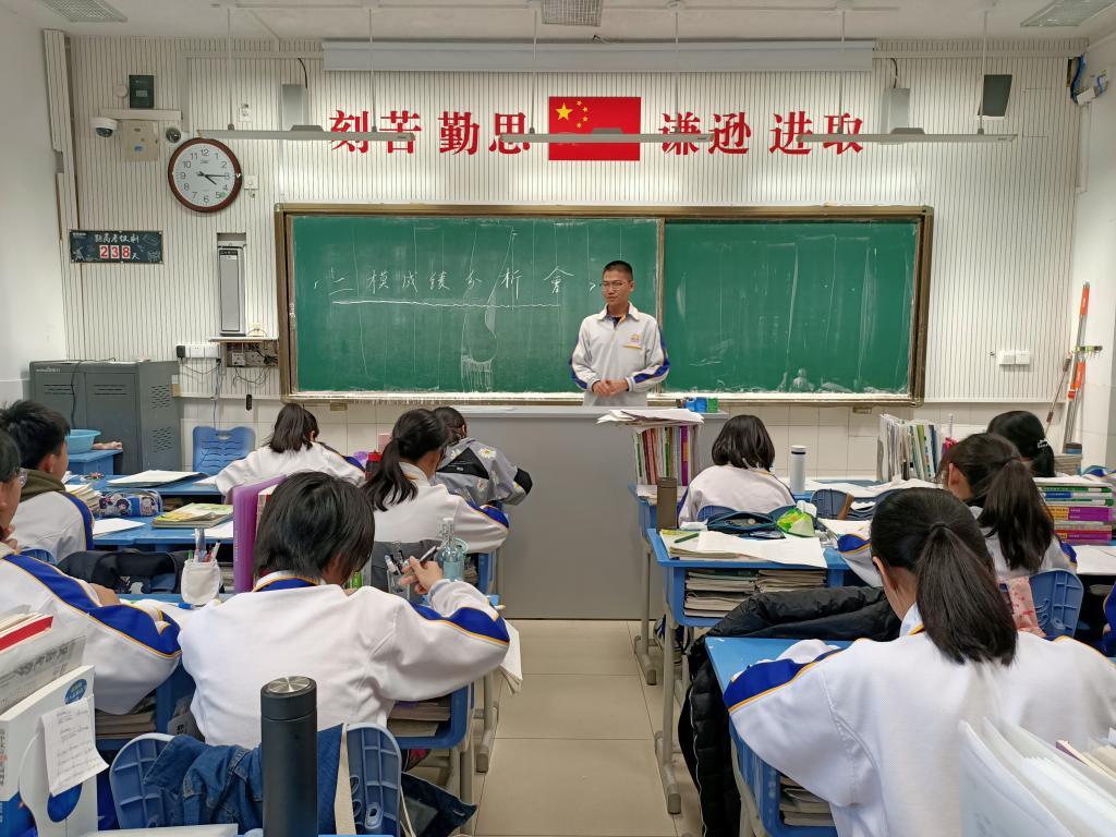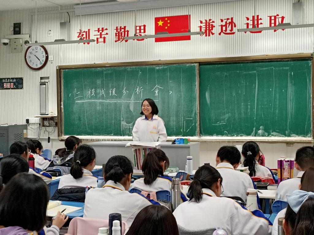 班会由班主任王介花主持。首先,王介花整体分析了全体同学的二模考试成绩,表扬了本次考试成绩优秀的同学和成绩进步最大的同学。