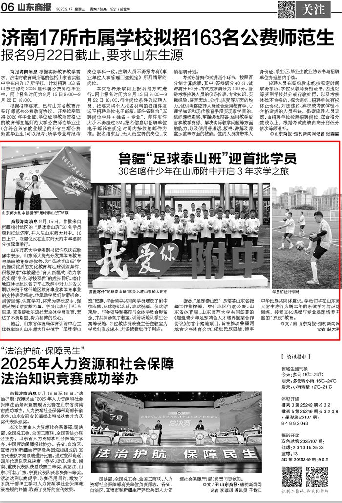 【山东师大新闻网编者按】9月16日上午,鲁疆青少年足球人才联合培养计划、首批“足球泰山班”在山东师范大学附属中学幸福柳校区开班,30名新疆维吾尔自治区喀什地区体育学校的学生将在这里度过3年高中时光。“足球泰山班”是落实山东省援疆工作指挥部、喀什地区行政公署、山东省体育局、山东师范大学共同签署的《加强青少年足球特色人才培养框架合作协议》的首个落地项目,旨在推动鲁疆两地青少年体育交流,促进民族团结,铸牢中华民族共同体意识。学员们将在山东师大附中进行为期三年的系统学习与足球训练,接受文化课程与专业足球培养并重的“双线”教育,吸引大众新闻、爱济南、山东文旅频道、文汇网、新黄河、大众网、山东商报、山东教育新闻等省市主流媒体报道,具体如下: