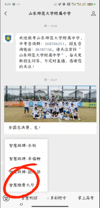 四、请幸福柳分校计划录取学生在20247月25日16:00前按照《山东师范大学附属中学在线缴费指南》(详见本文文末)步骤完成网上微信缴费,缴纳高一第一学期学费7500元(可由家长或亲友代缴,须提前准确获知录取学生的身份证号)。
