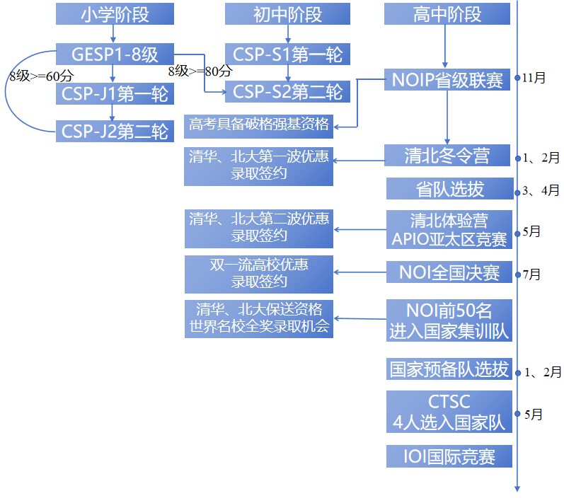 新高考背景下,高校选拔方式日趋多元,信息学奥赛成绩已成为众多双一流高校选拔优质生源的重要参考依据。 在NOI 赛事中获得金牌并入选国家集训队的学生,可直接获得保送资格;获得银牌的学生,可参加破格强基计划选拔;获得省二等奖及以上的学生,可通过综合评价招生渠道报考心仪高校;即使目标是海外名校,信息竞赛证书同样是申请材料中的加分项,能够有效提升个人竞争力。