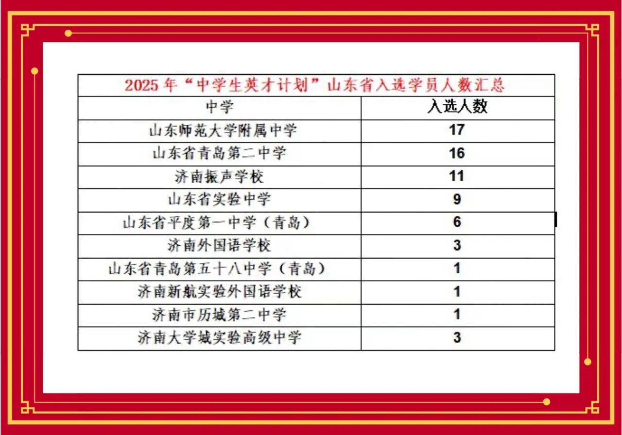 山东师大附中是中学生英才计划中学培养基地,在山东省2025年度“中学生英才计划”选拔活动中,山东师大附中17名学生成功入选,入选人数再创历史新高,已连续三年稳居全省第一:2023年入选13人,2024年入选15人,2025年增至17人,实现“三连冠”突破。自2013年该计划启动以来,山东师大附中共139人获此殊荣,为山东各中学之首。