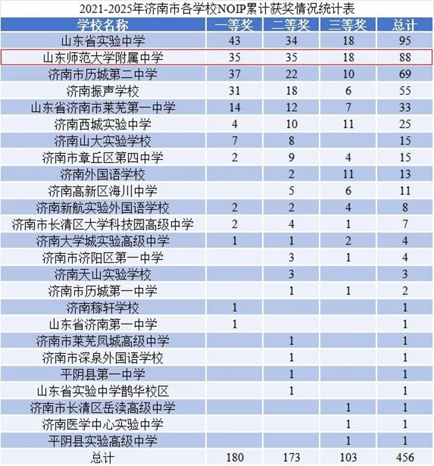 近五年来,山东师大附中在NOIP中累计获奖88项,稳居济南市前列,充分体现了学校信息学教育的深厚积淀与持续竞争力!