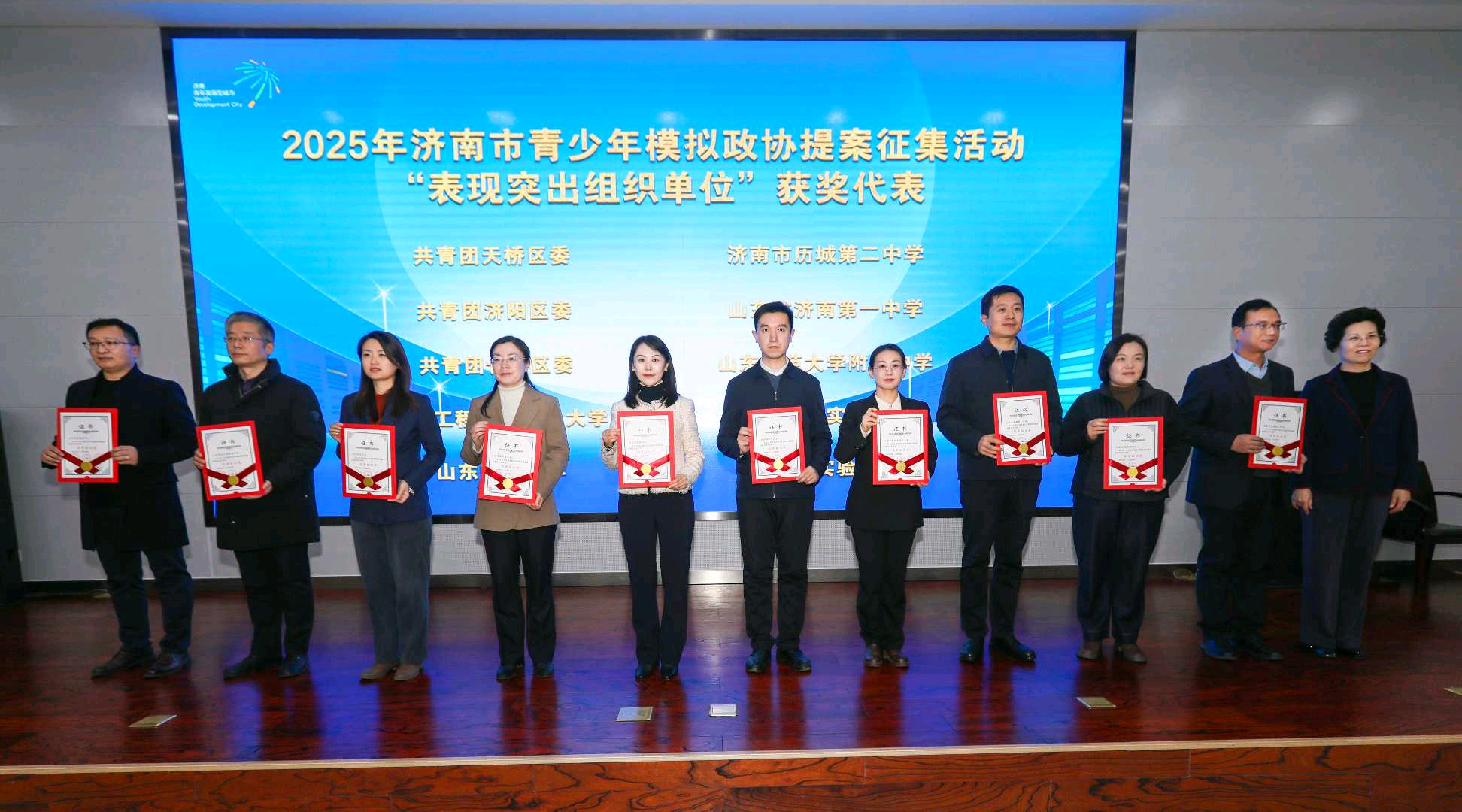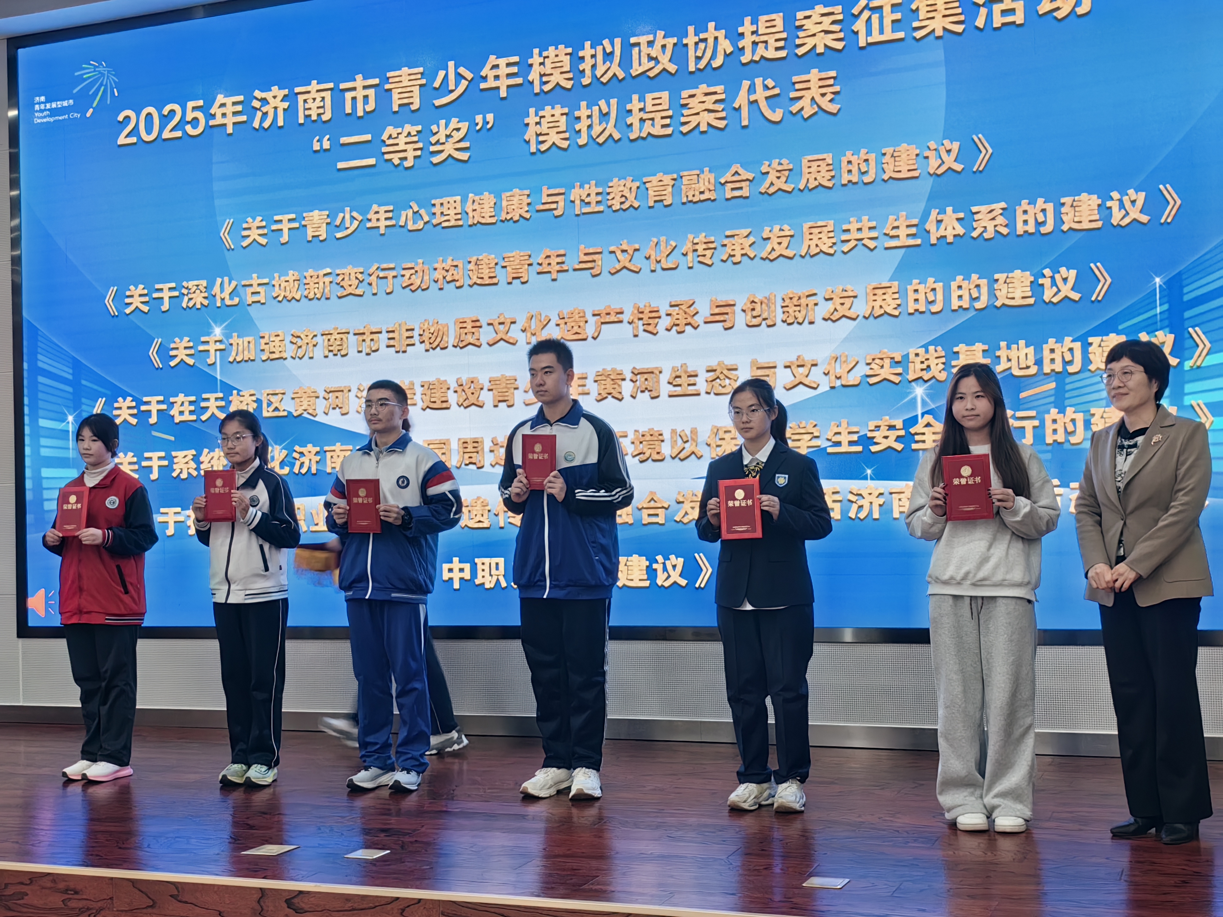 近日,由共青团济南市委、市委宣传部、市政协办公厅、市教育局、市学联主办的2025年度济南市青少年模拟政协提案集中展示活动圆满落幕。山东师大附中在此次提案征集活动中表现亮眼,共提交147份成熟提案,其中1份提案荣获一等奖,4份提案获二等奖,3份提案获三等奖,另有十余份提案入围优秀奖,学校被授予“表现突出组织单位”荣誉称号。山东师大附中党委副书记、纪委书记杨增良、团委书记董延强、获奖学生代表2025级3班卢卓妍参加活动。