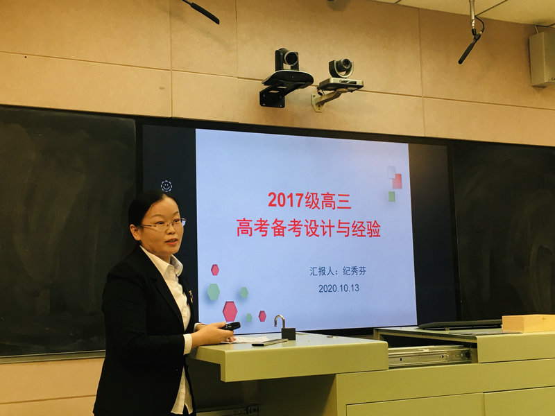 研讨会首先由冯照作题为《2020年高考试题分析与启示》报告。冯照结合具体题目深入浅出地分析了2020年山东卷高考题的命题新变化和新特点,对新高考的改革方向进行解读,为新高三的复习和高一高二的教学提供了有益的借鉴。2017级校本部备课组长纪秀芬汇报2017级高三高考备考设计与经验。纪秀芬从听力、阅读、写作等具体题型入手,详细介绍了2017级高三在备考中的一些有效做法和经验。最后,董锟老师分享了自己对于读后续写新题型的解读。